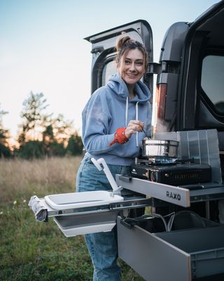 Kilka nowości w modelu RAXO ESC - wysuwany blat ze sklejki antypoślizgowej z funkcją stolika zewnętrznego.