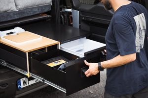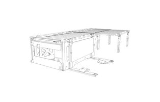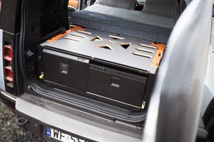 Dużo miejsca na bagaż. Wysuwana szuflada mieści lodówkę kompresorową, niezbędne rzeczy do gotowania i zmywania oraz blat roboczy. Po boku drzwiczki, a dzięki nim zmieścisz supa lub narty.