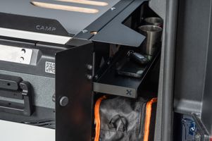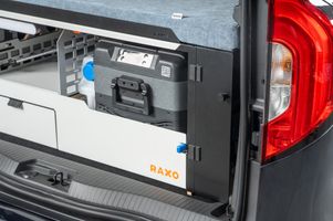 Wysuwana duża szuflada z lodówką. dodatkowy moduł ze zlewem i elektryczną pompą z wylewki typu prysznicowego. Przestrzeń na plecak lub inne przedmioty związane z twoim hobby.