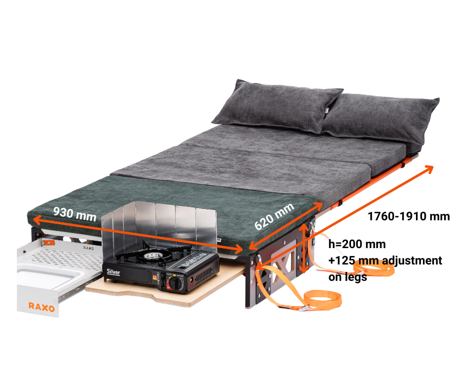 Dieses SLIM-Modell bietet viel Kopffreiheit. Es verfügt über ein ausziehbares Küchenmodul mit Schließsystem, ein geschlossenes Wassersystem mit Spüle und Dusche, einen Gaskocher und eine Thermoabdeckung. Die solide Konstruktion – eine Kombination aus Sperrholz und Stahl – sorgt für jahrelange Haltbarkeit.
