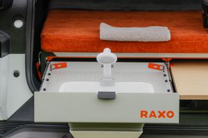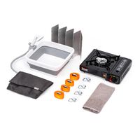 Gas stove and portable board/table. Water system: 10L tank + battery-powered shower