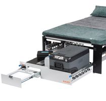Wysuwana duża szuflada z lodówką. dodatkowy moduł ze zlewem i elektryczną pompą z wylewki typu prysznicowego. Przestrzeń na plecak lub inne przedmioty związane z twoim hobby.